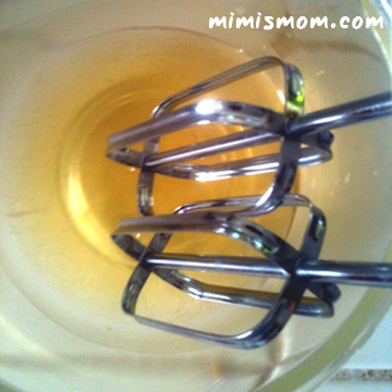 Then I poured the oils to a glass bowl and added the grapeseed. That didn’t need to be heated, as it’s already liquid at room temperature. At this point, you could also add essential oils to scent your lotion. Mine, unscented, has a very faint honey smell. You can then walk away for a few minutes if desired, or stick it in the fridge for a few. I was lazy and threw some ice packs under the bottom of the bowl. Then I took my handheld blender and went to work!