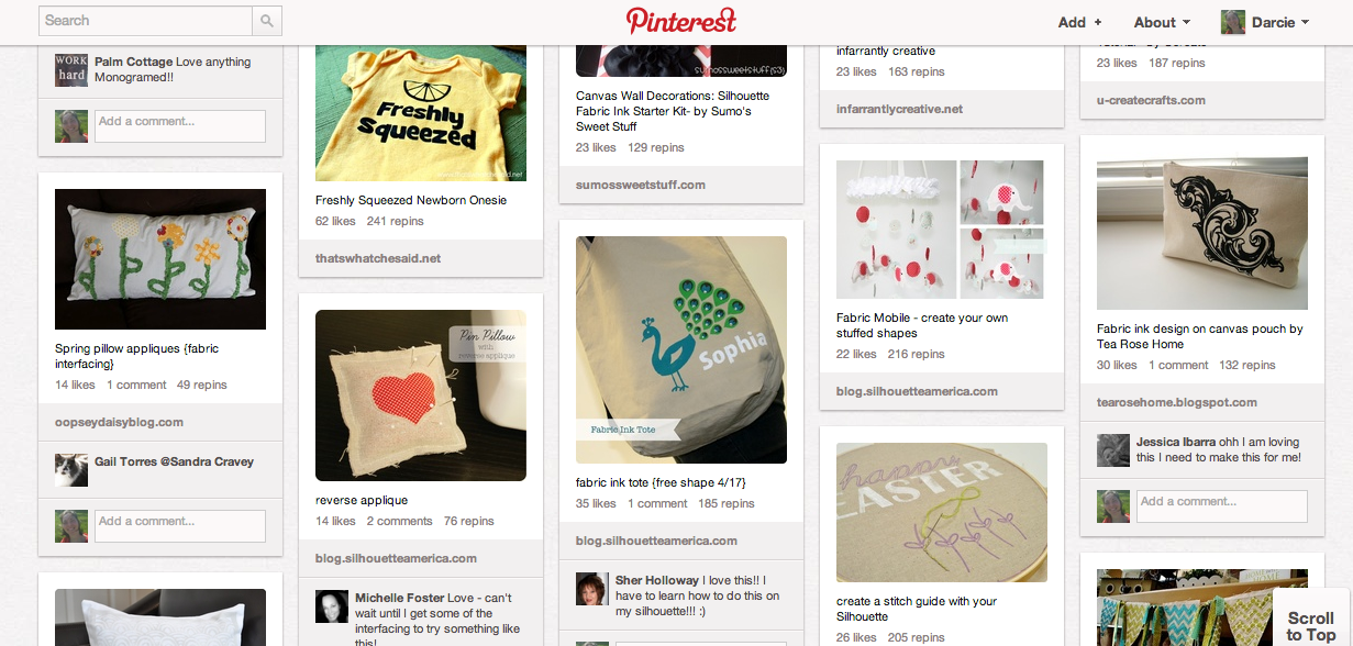 I pinned it as per their directions, but Pinterest ate the image! So here’s a link to it that I’m adding to the pin. This would enable me to do so many more awesome things! Here’s some awesome fabric projects they have pinned right now-